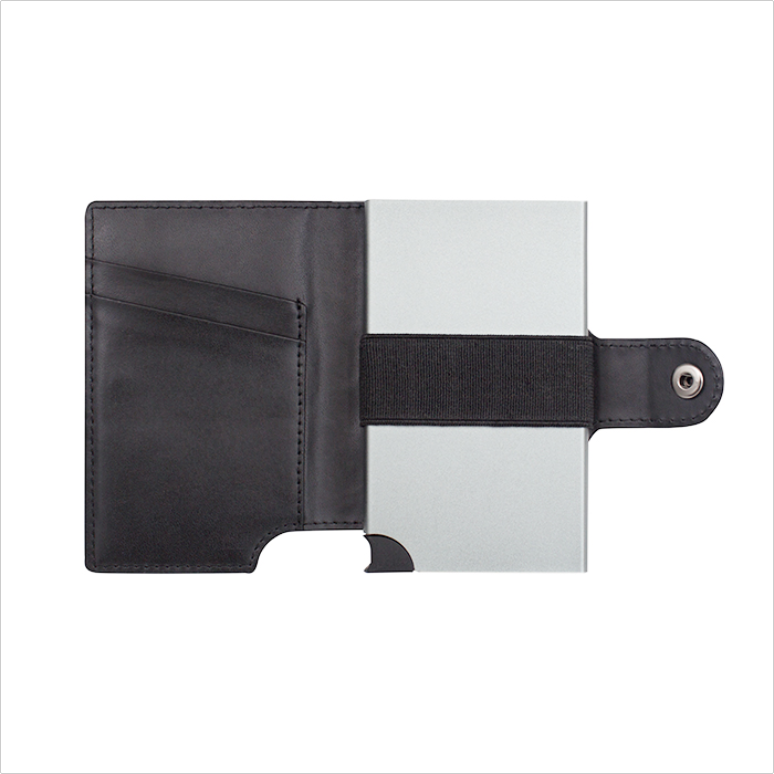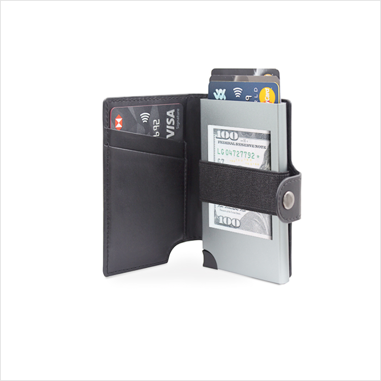 - 真皮 -RFID鋁製卡槽 -卡滑塊觸發器 -最多可容納9張卡 -現金束帶