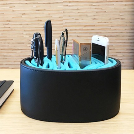 這款德國MODERN雜物收納盒,時尚典雅、多功能收納盒採用黑色皮革材料製成,橢圓形盒內填充藍色毛氈材料,使收納空間更彈性化。 它不僅可以收放鉛筆、剪刀、眼鏡、手機等,更是日常的家務助理,還可以在日常的辦公中使用。毛粘料使每一個東西都穩固地連接 在一起,並確保沒有被劃傷,是您桌面的好夥伴。