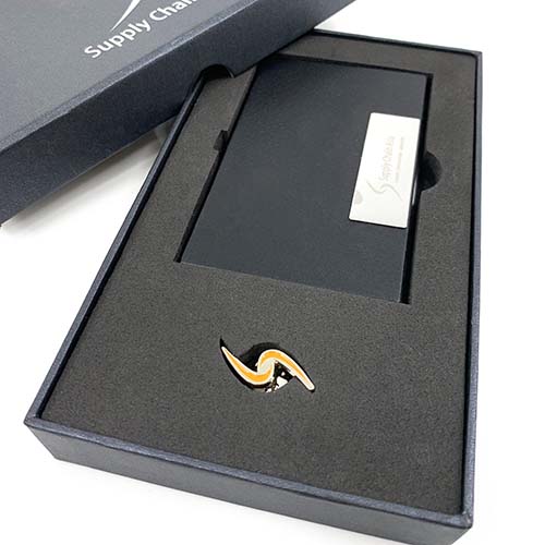 精美皮製名片盒,搭配一枚精緻的徽章